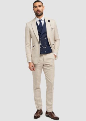 Cavani Caridi Beige 3 Piece Contrast Suit With Navy Waistcoat