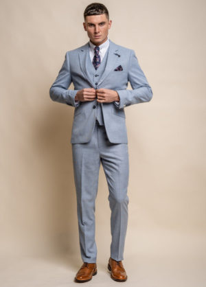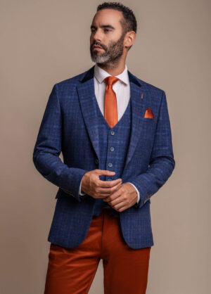 Original price was: £224.95.£160.00Current price is: £160.00.Cavani Kaiser Blue 3 Piece Contrast Suit With Rust Chino’s