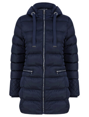 Women’s Mid-Length Padded Black & Blue Hooded Coat