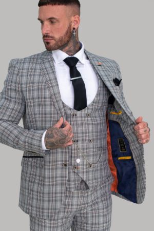 A stylish Cavani grey check three piece suit featuring a sharp slim fit and modern tailored design. Perfect for weddings, formal occasions, and standout smart menswear styling.