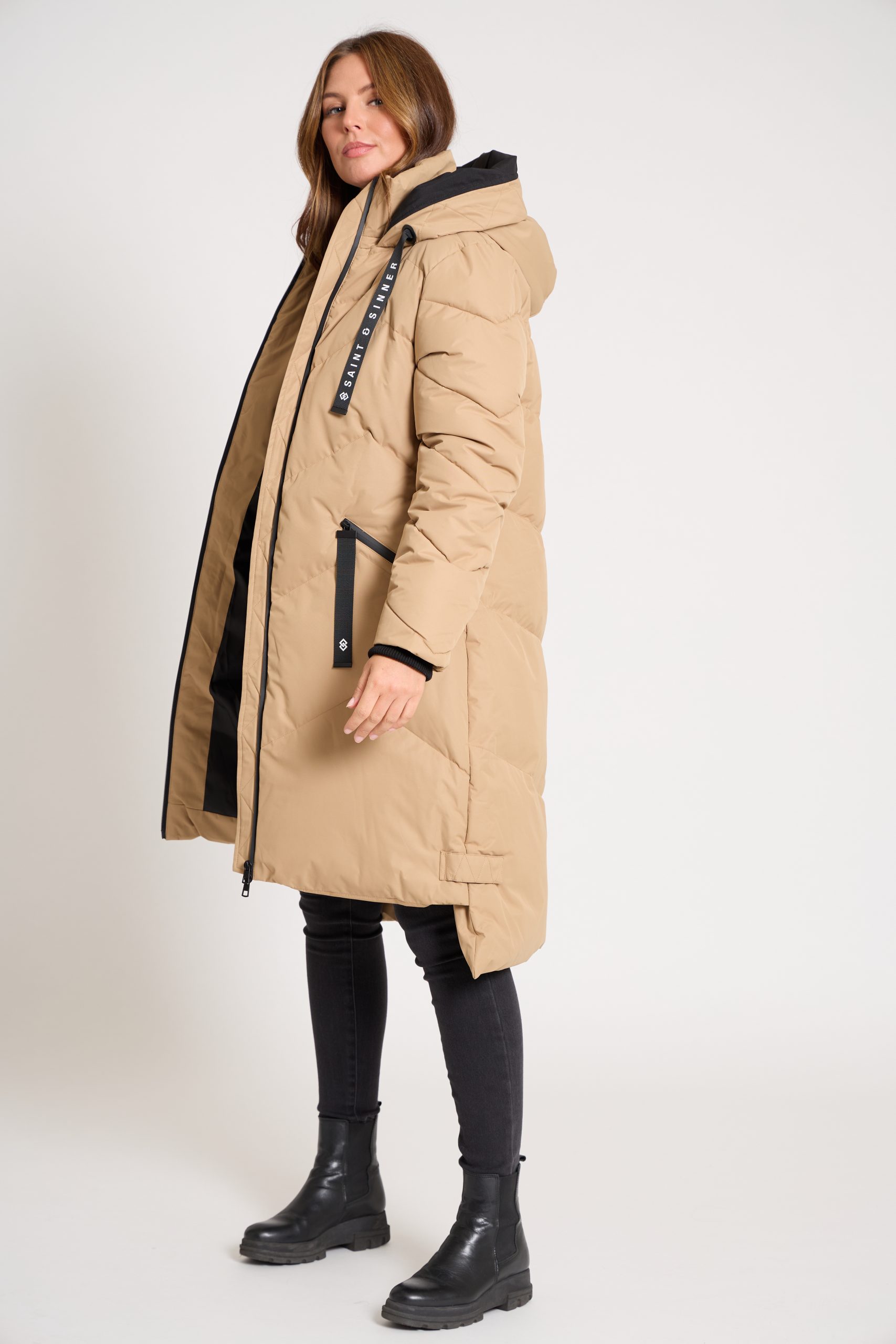 Women’s Long Padded Khaki & Black Hooded Winter Coat