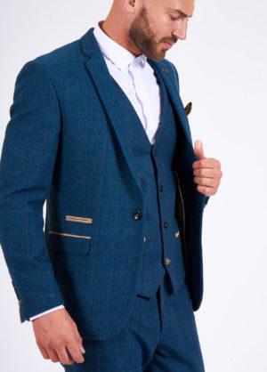 Marc Darcy Dion Blue Tweed 3 Piece Suit With Cream Waistcoat