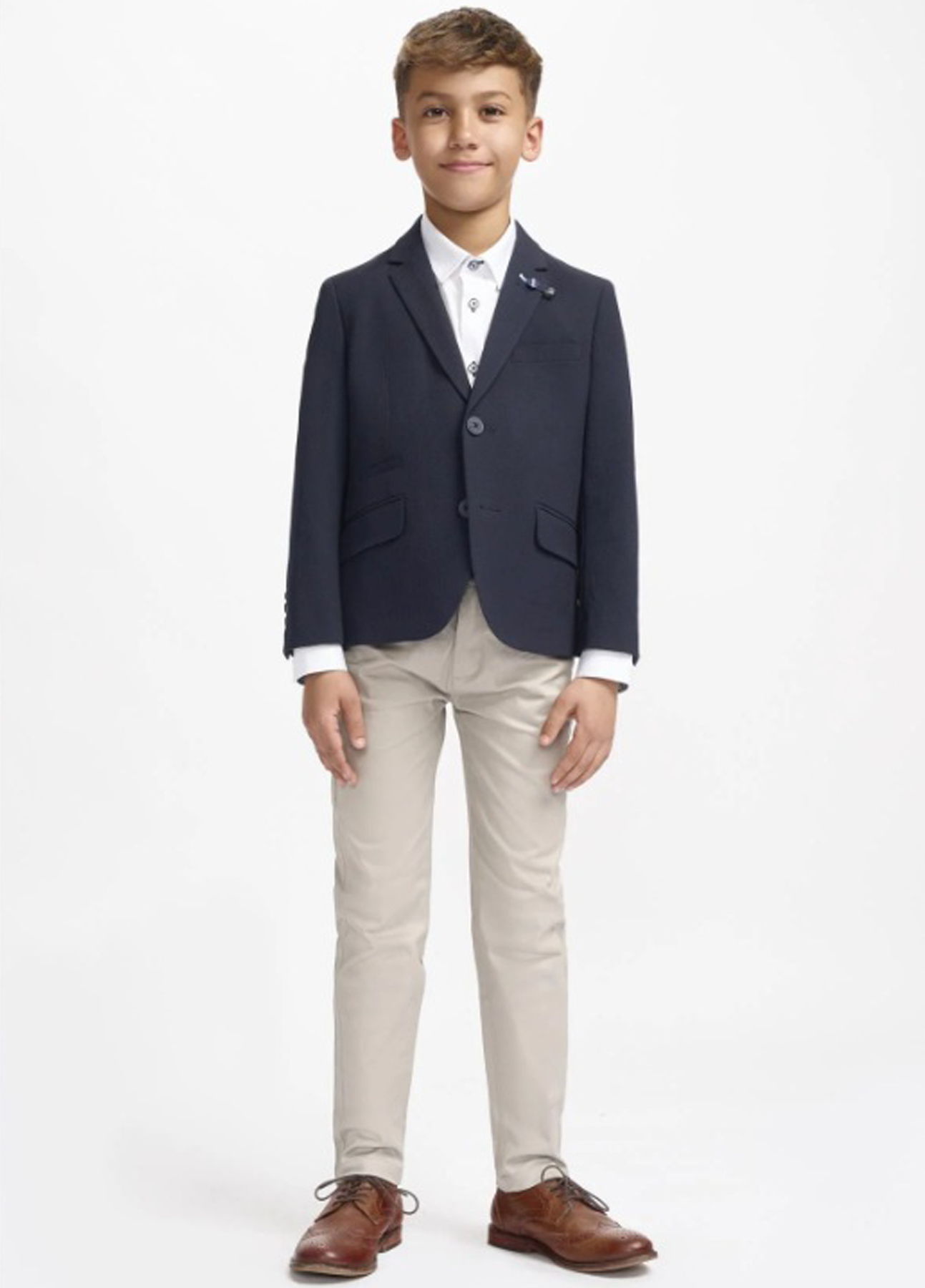 Start the little man’s suit collection with this chic and stylish 2 piece contrast suit with a smart blazer and chino’s