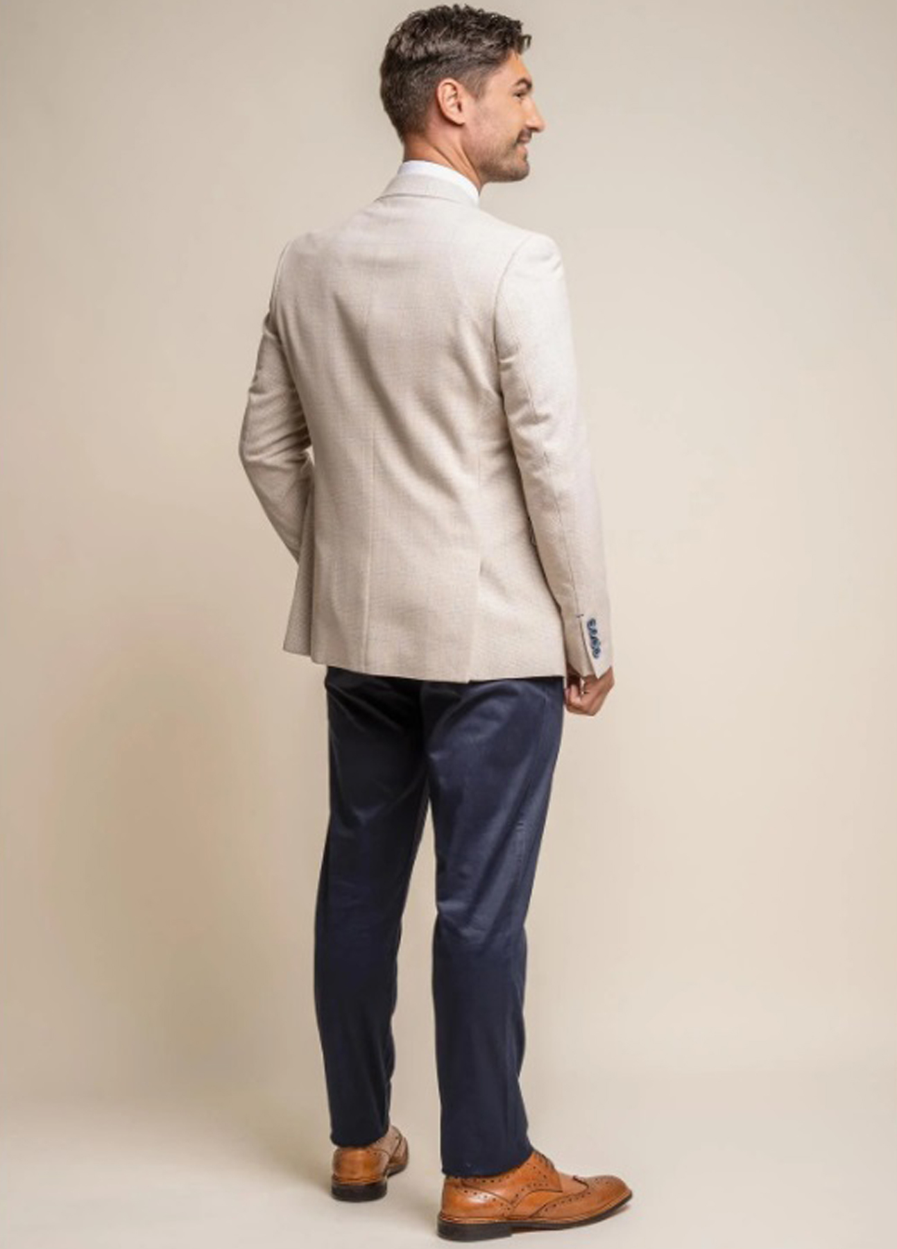 This is the perfect outfit for your event. Cream blazer with blue check lines contrasted with navy blue chino’s makes this suit standout