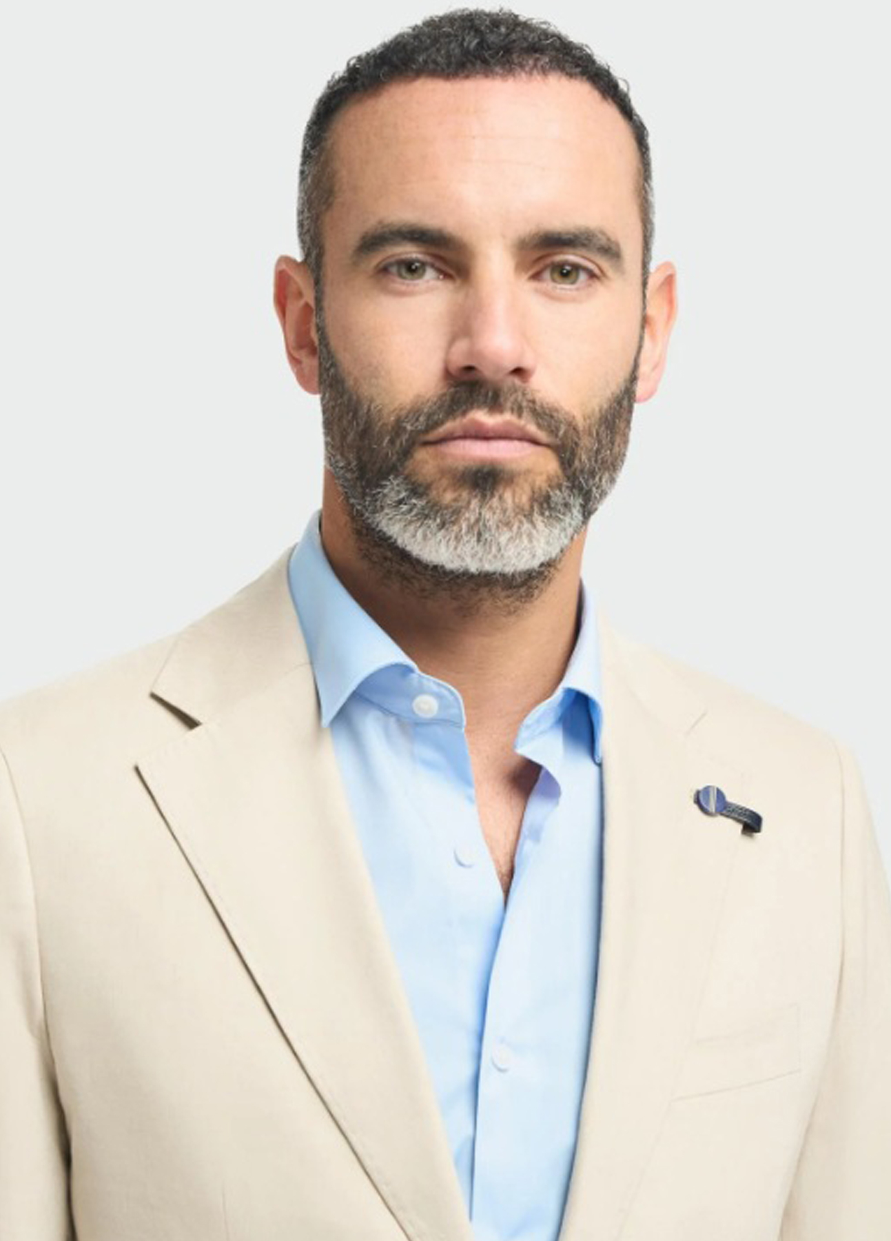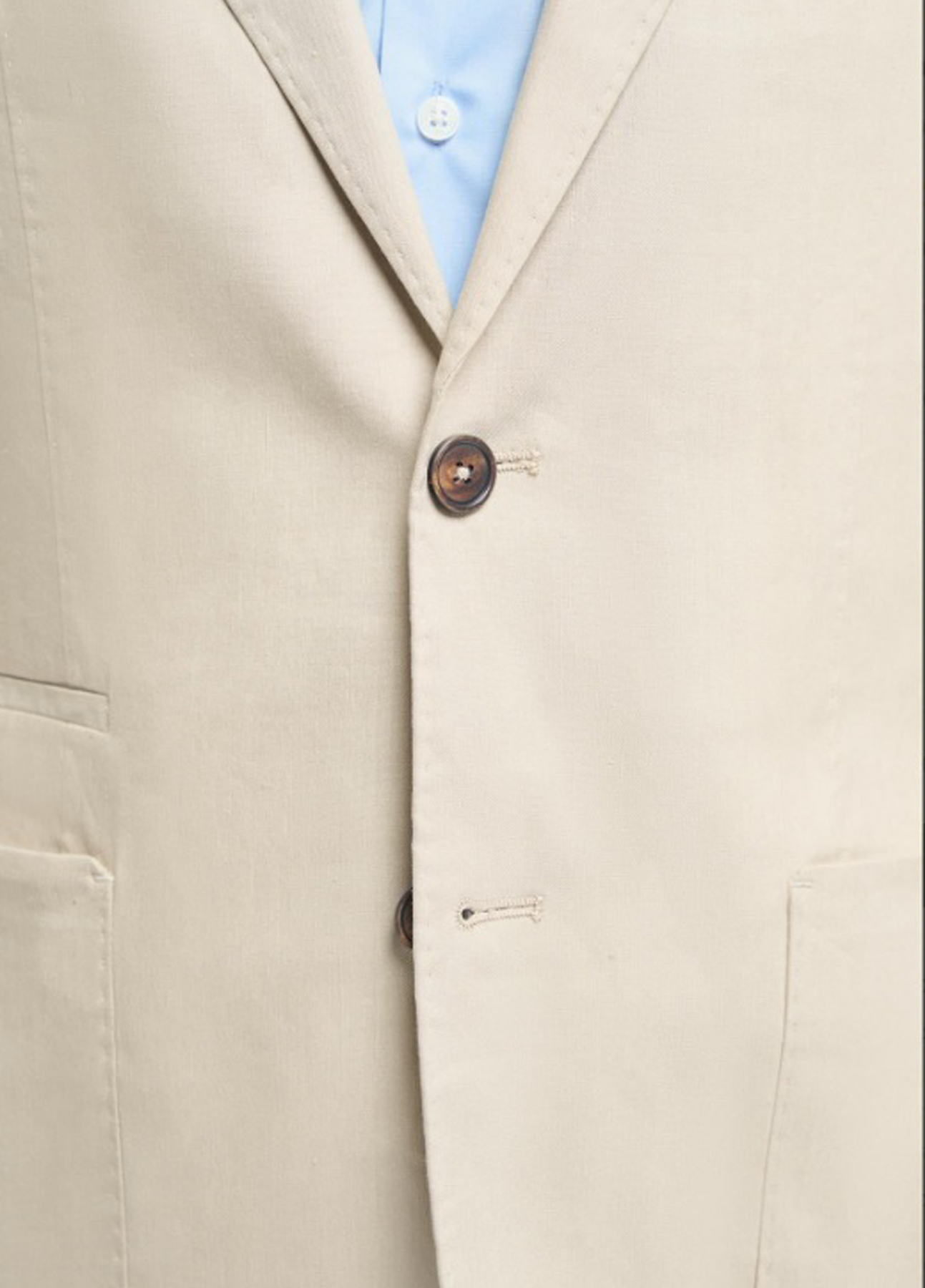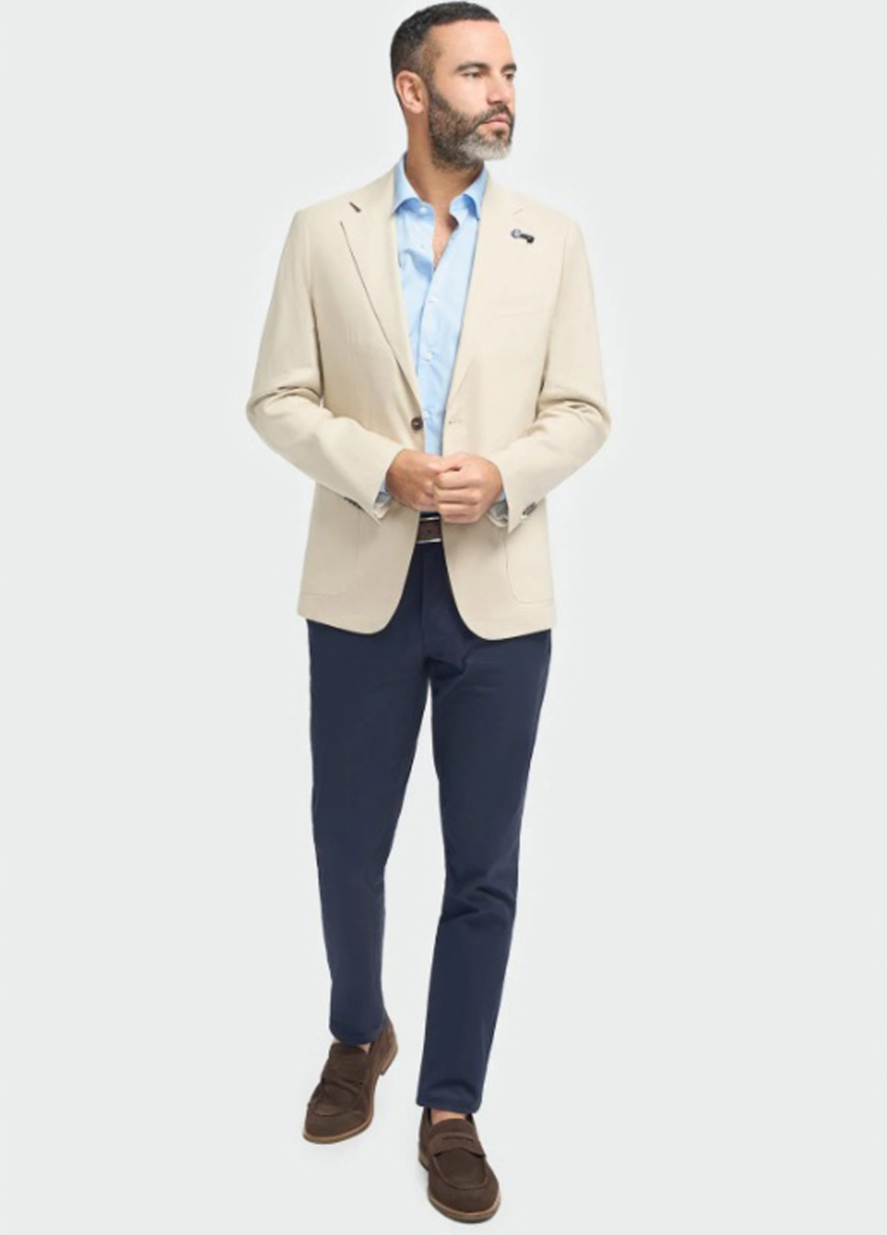 This is the perfect outfit for your event. cream linen blazer contrasted with navy chino’s makes this suit standout