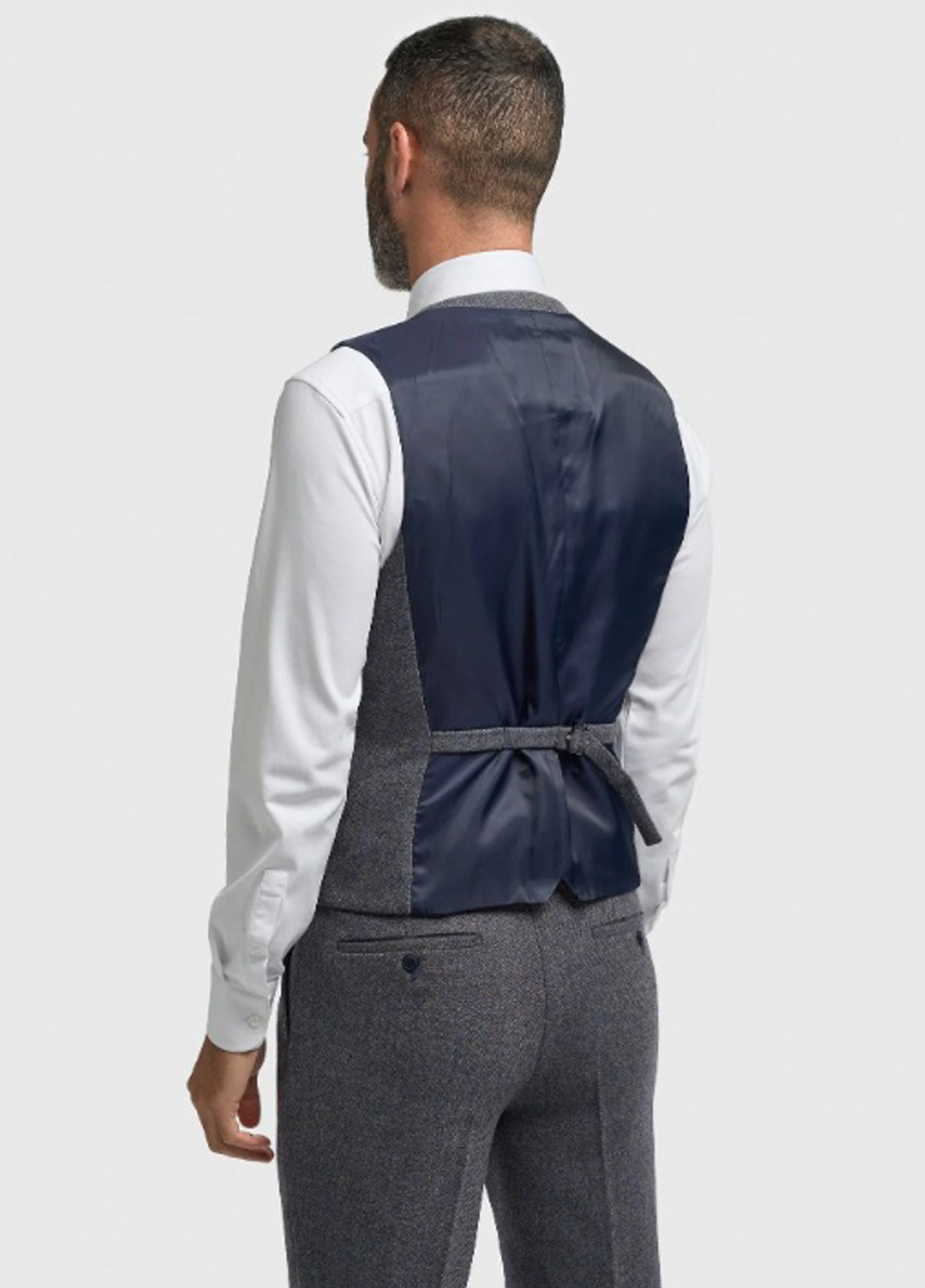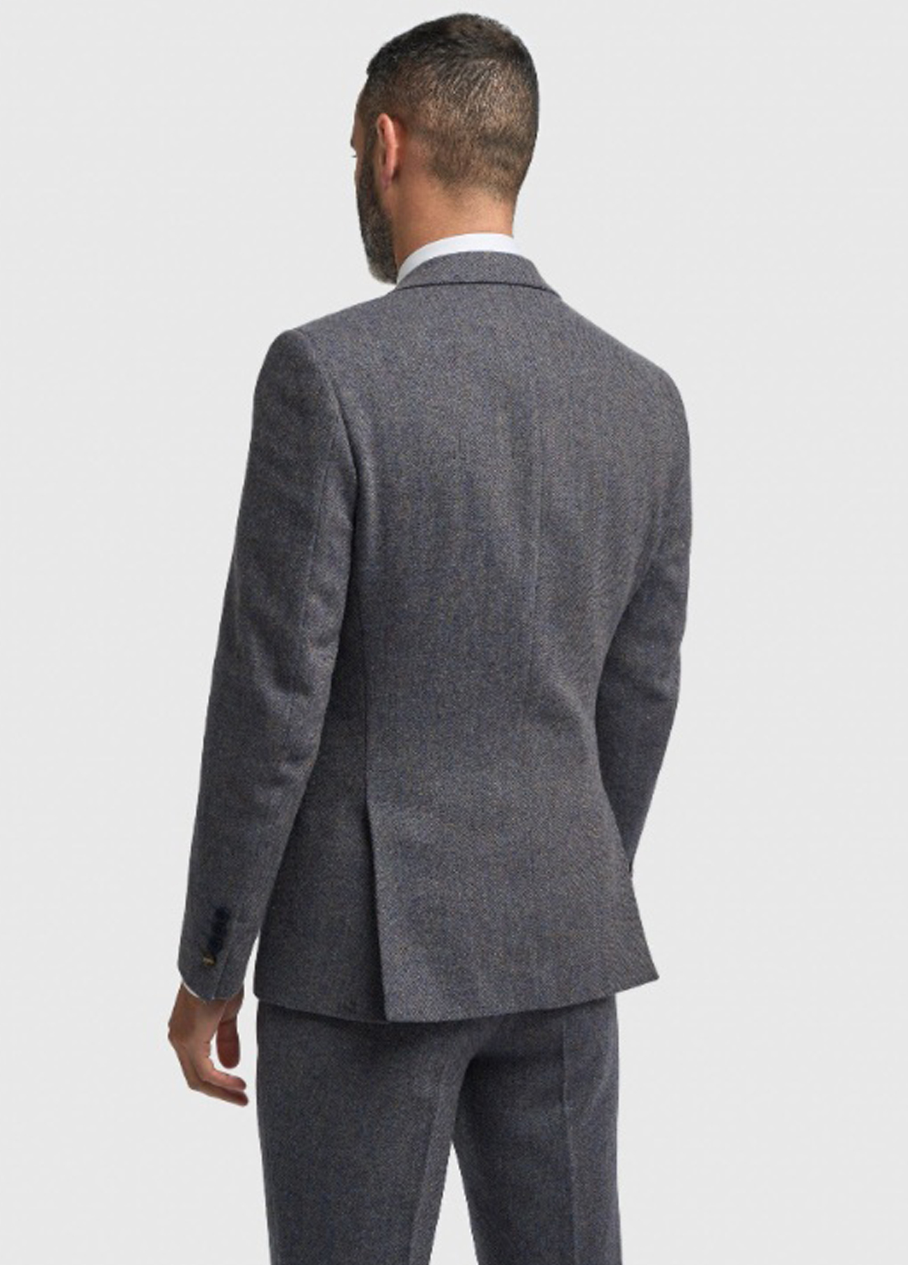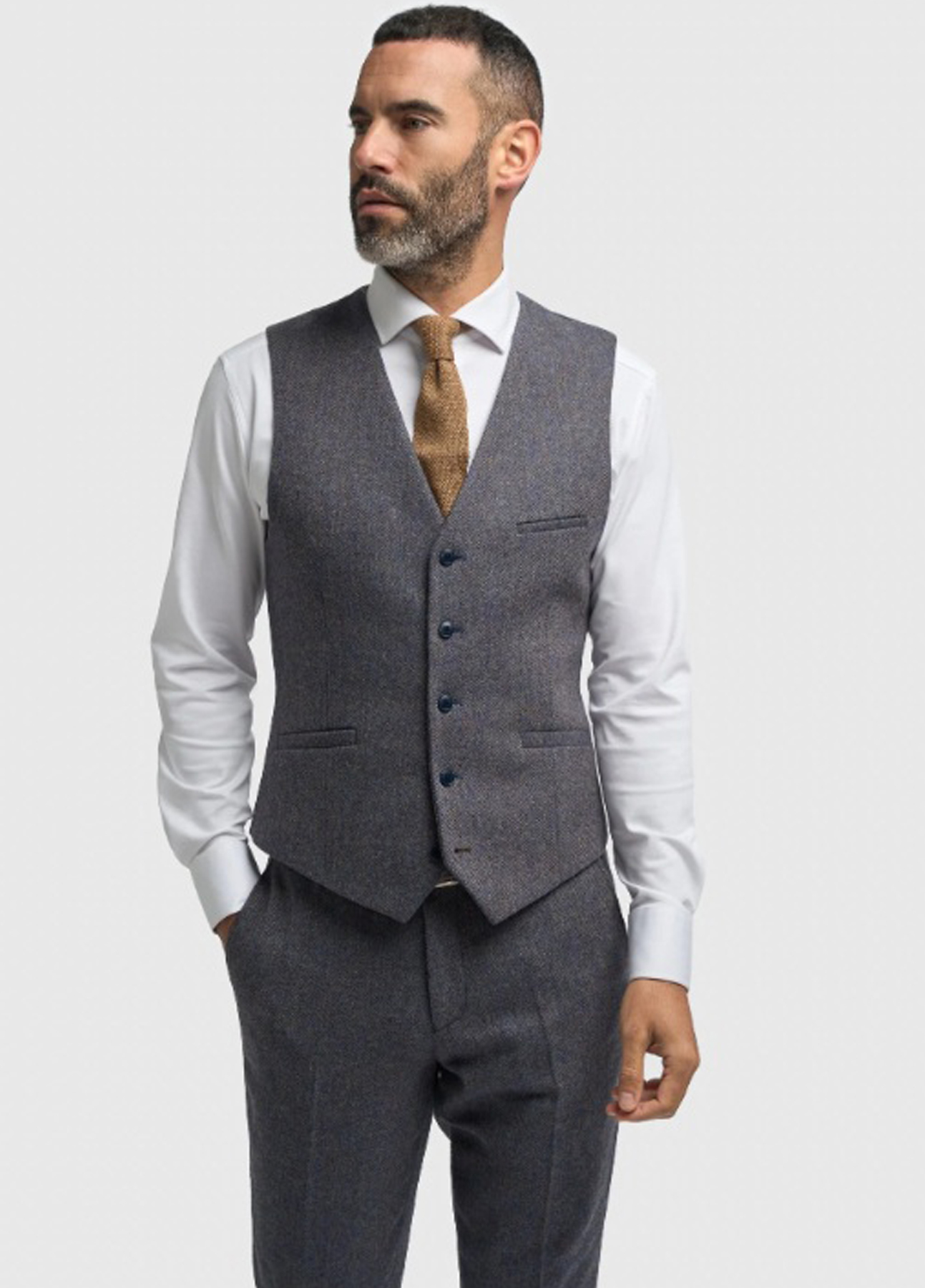 Capture a unique look with this elegantly crafted herringbone grey with heavy undertones of navy tweed 3 piece slim fit suit