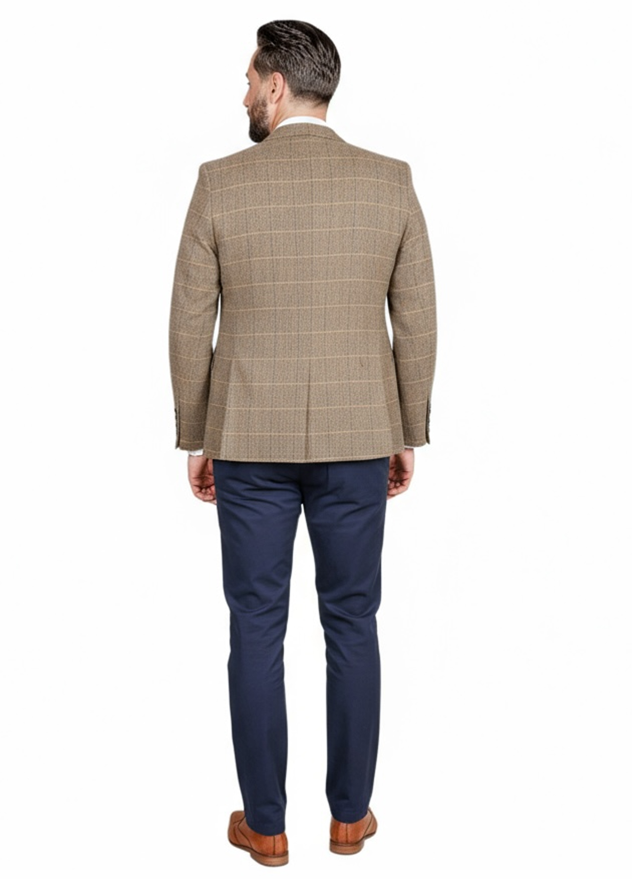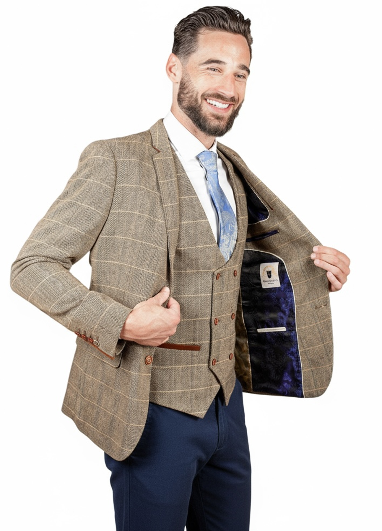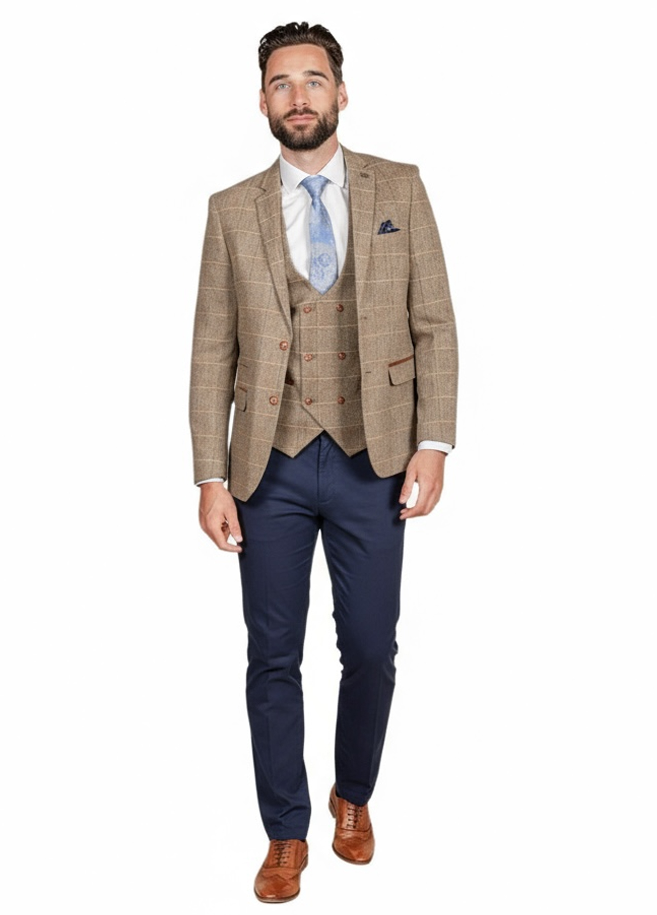 - Style: Tan Tweed 3 Piece Suit with Contrast Navy Chino’s