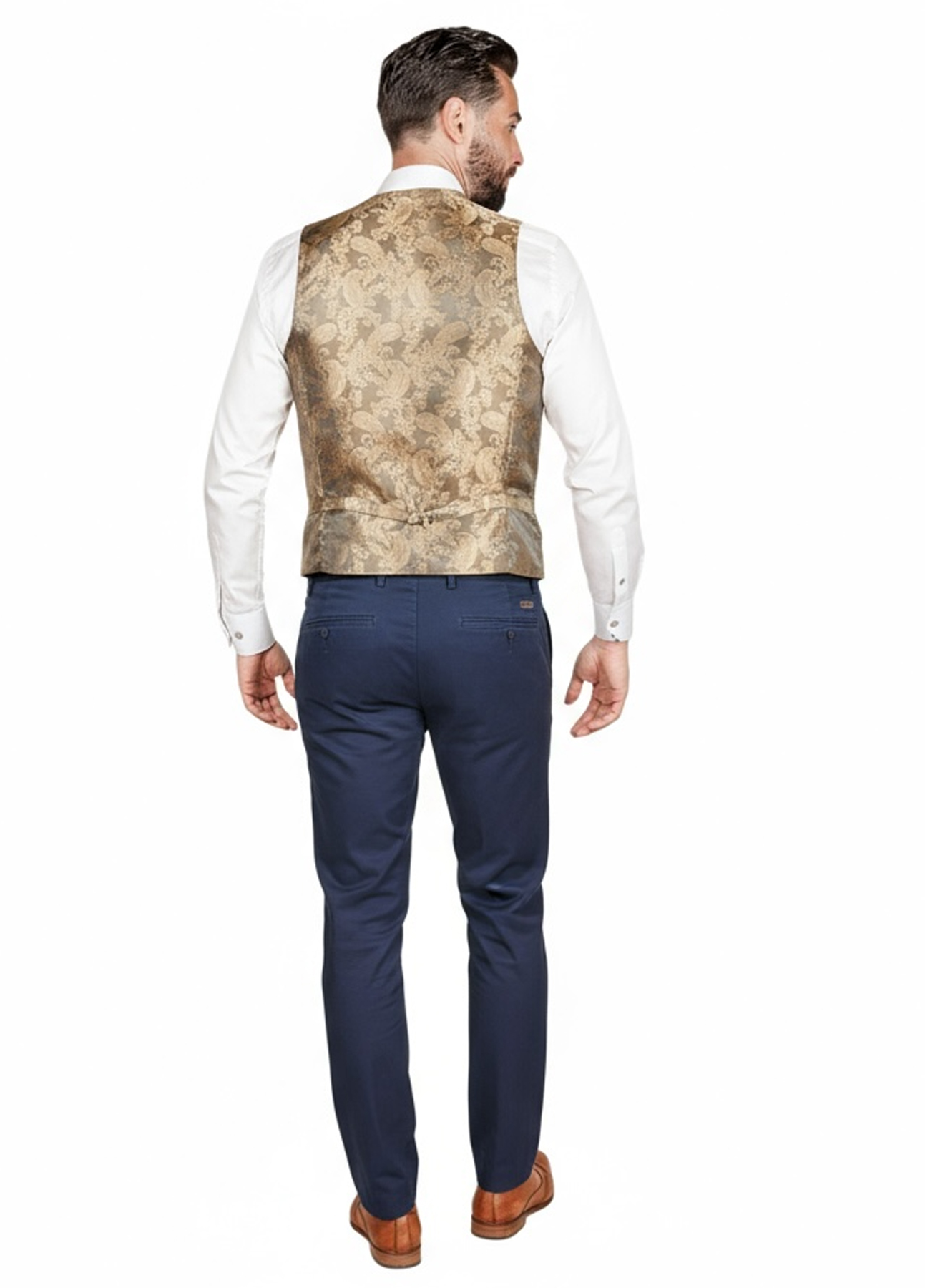 - Waistcoat: Double-breasted, adjustable back with gold paisley lining