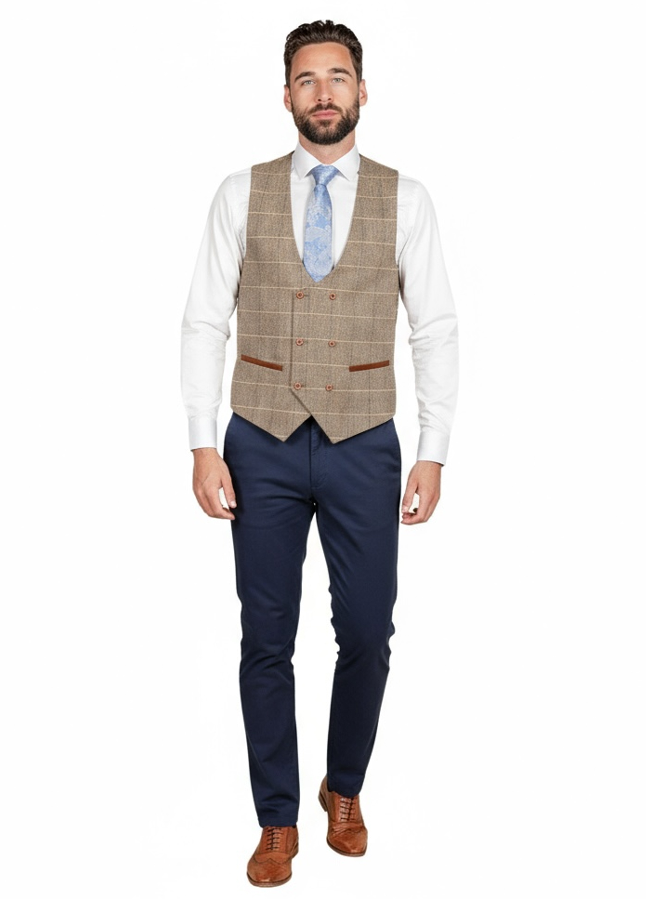 Crafted with precision, this contrasting tweed jacket and waistcoat blend traditional British tailoring with modern sophistication. The tan check tweed features subtle blue accents that complement the deep navy chinos, creating a versatile outfit ideal for weddings, races, parties and smart formal events.