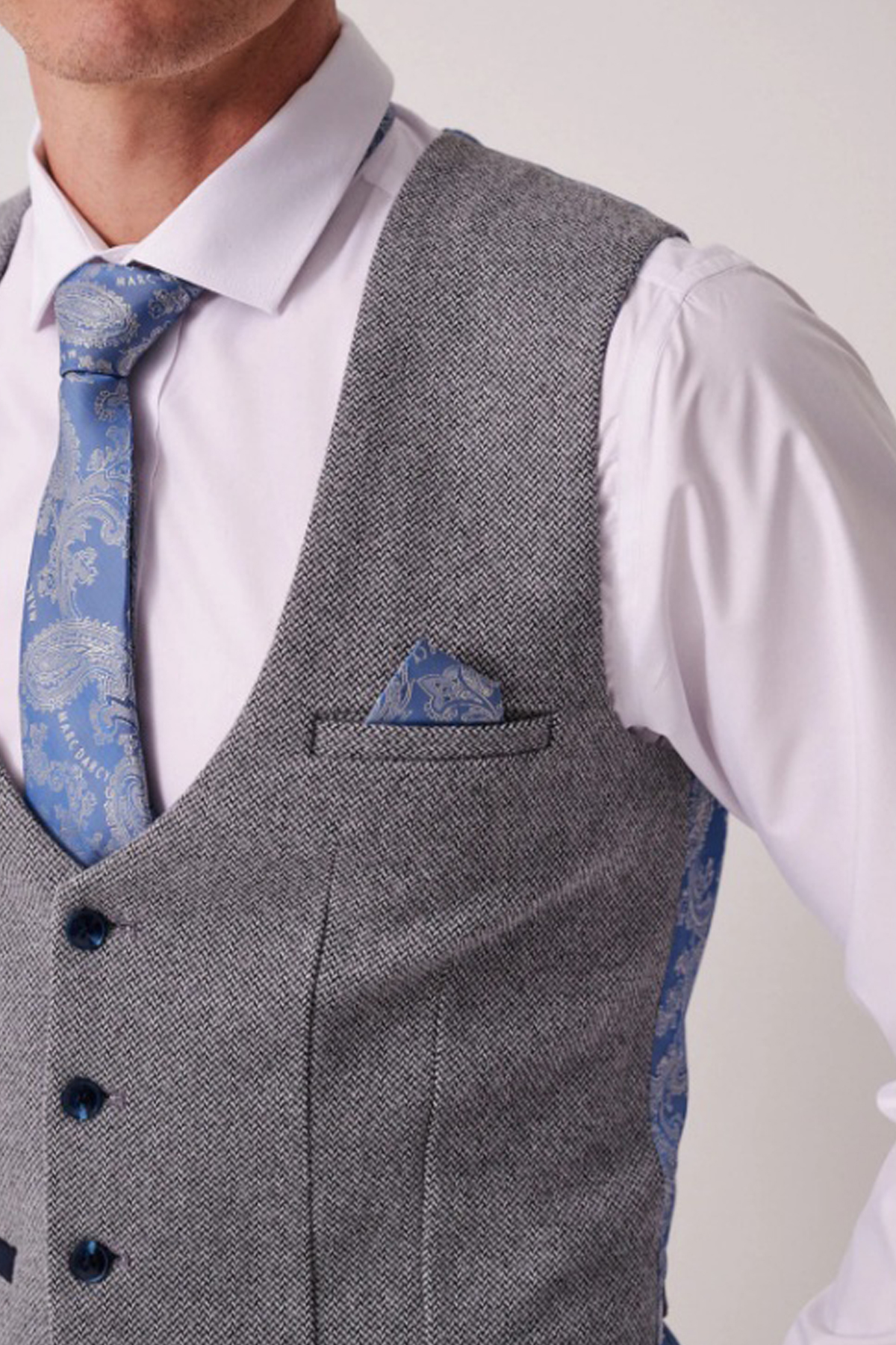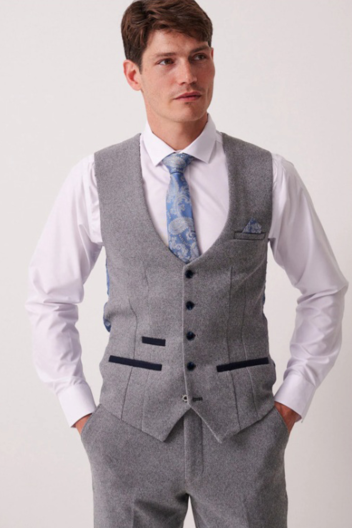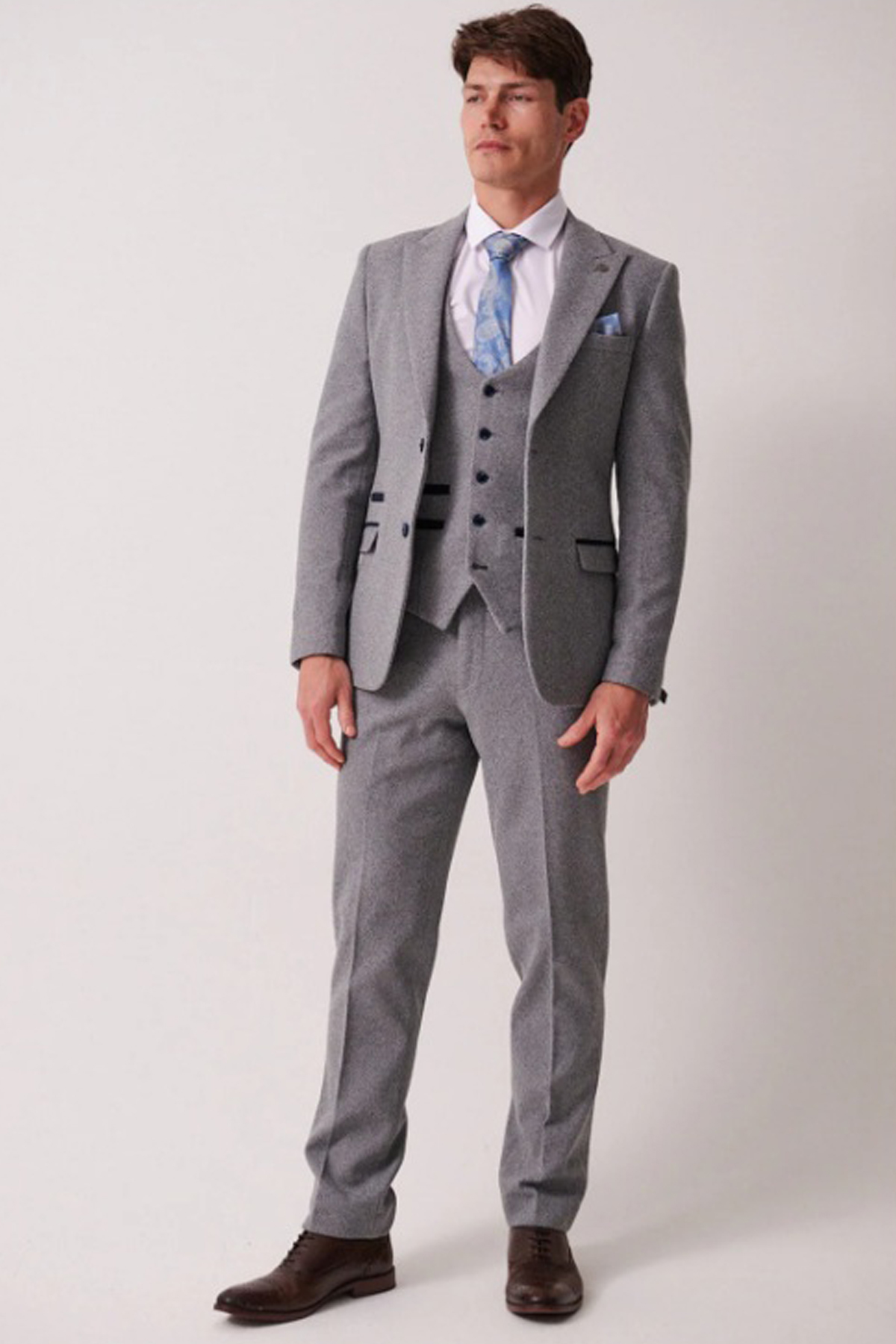 This Marc Darcy silver grey three piece tweed suit is a stylish choice for weddings, race days, formal events and smart occasions. Designed in a refined grey textured fabric, it features a smart blazer, matching waistcoat and trousers, with navy contrast detailing and a polished formalwear finish.