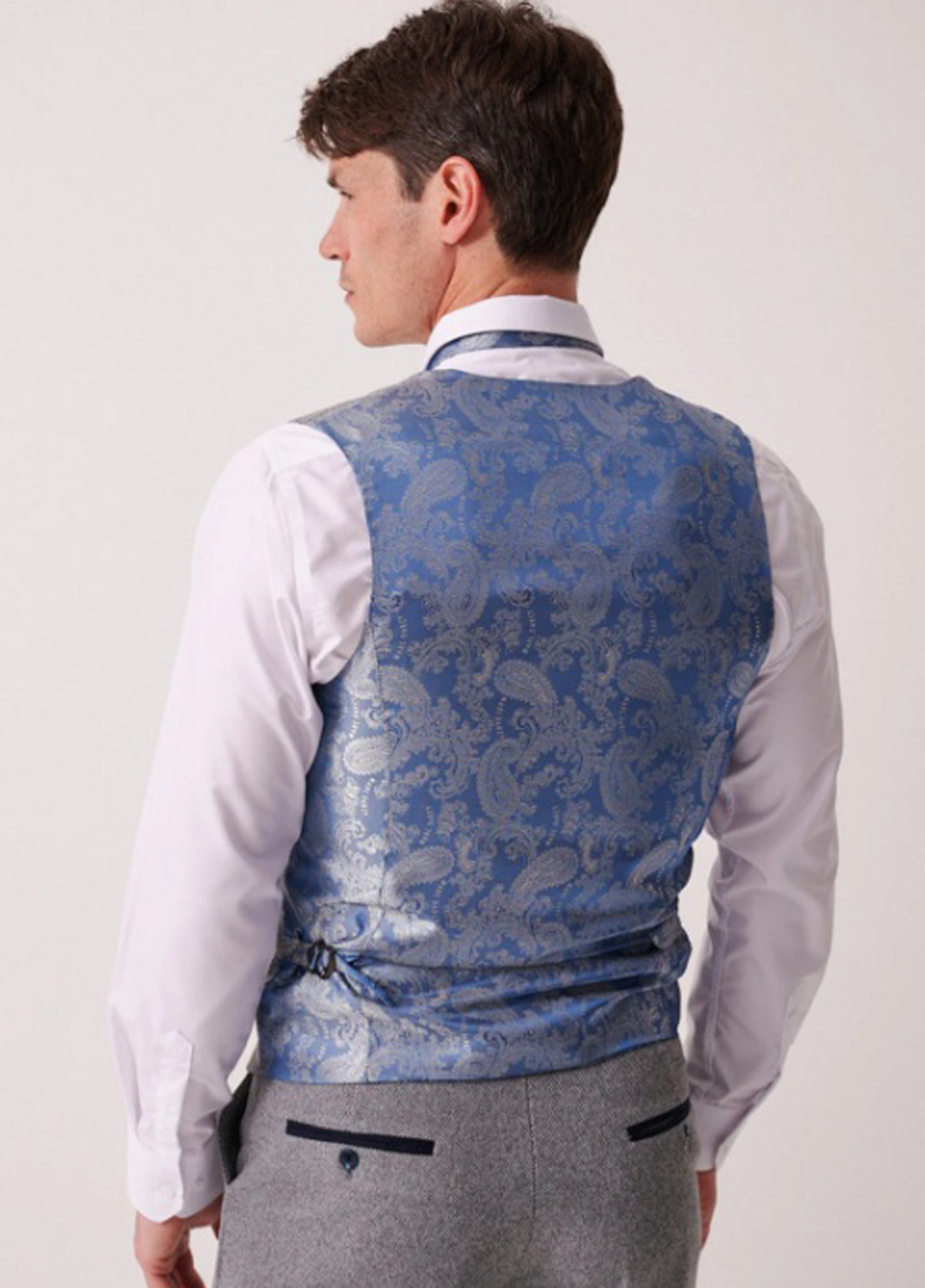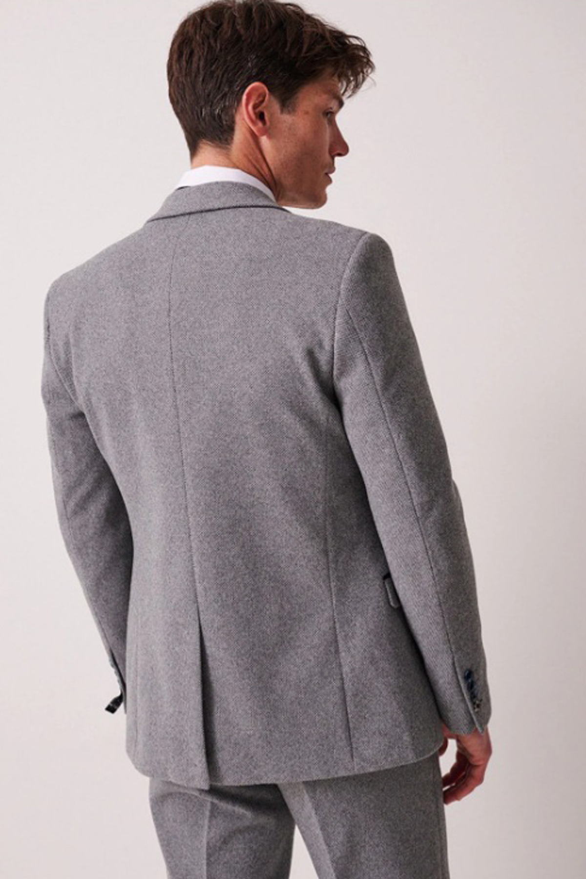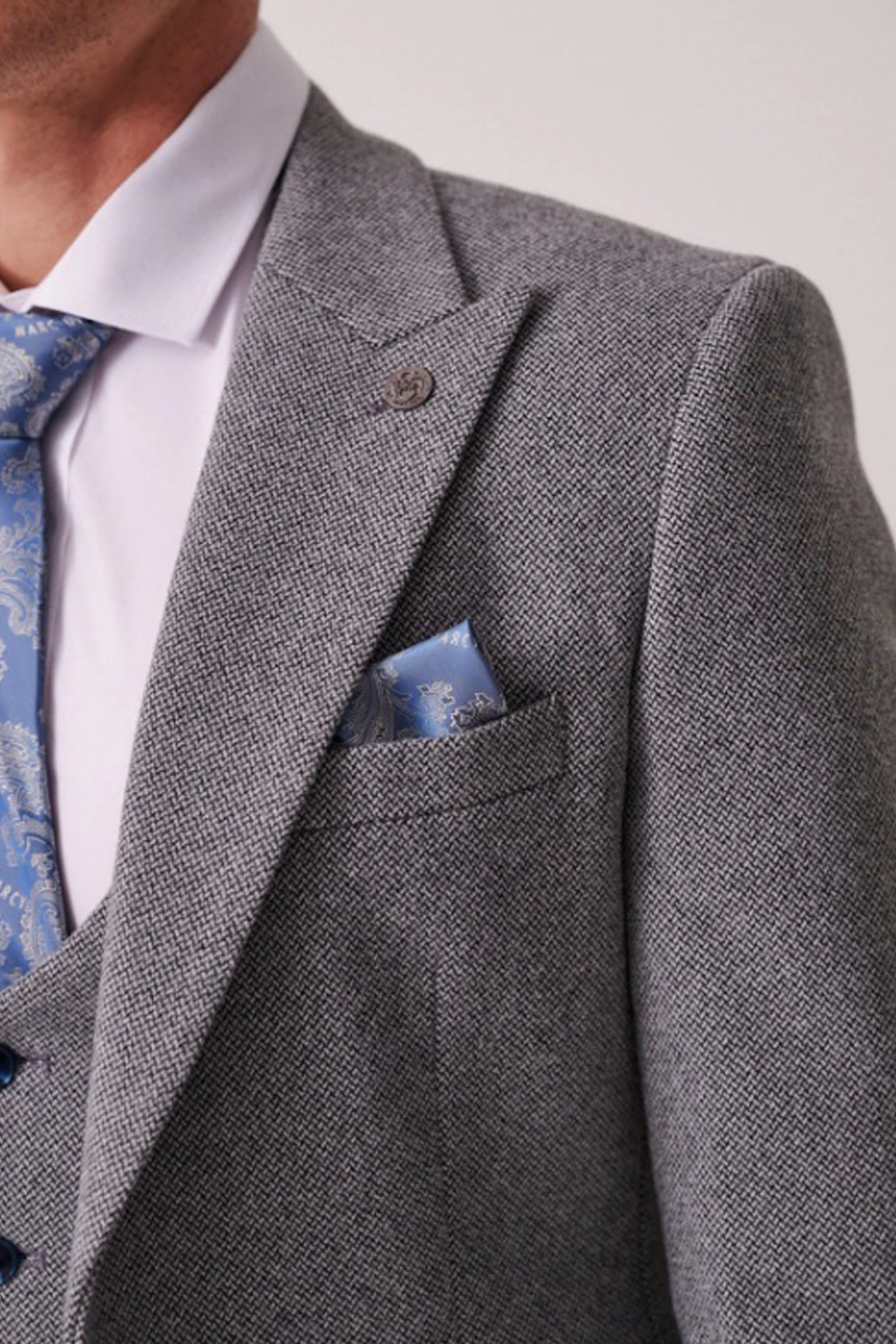 This Marc Darcy silver grey three piece tweed suit is a stylish choice for weddings, race days, formal events and smart occasions. Designed in a refined grey textured fabric, it features a smart blazer, matching waistcoat and trousers, with navy contrast detailing and a polished formalwear finish.
